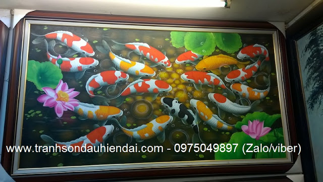 Cửu ngư quần hội là tranh vẽ chín chú cá chép bơi lội sinh động bên hoa sen, hoa mẫu đơn hay tán trúc xanh. Trong phong thủy, bức tranh này mang lại sinh khí mạnh mẽ cho không gian sống.